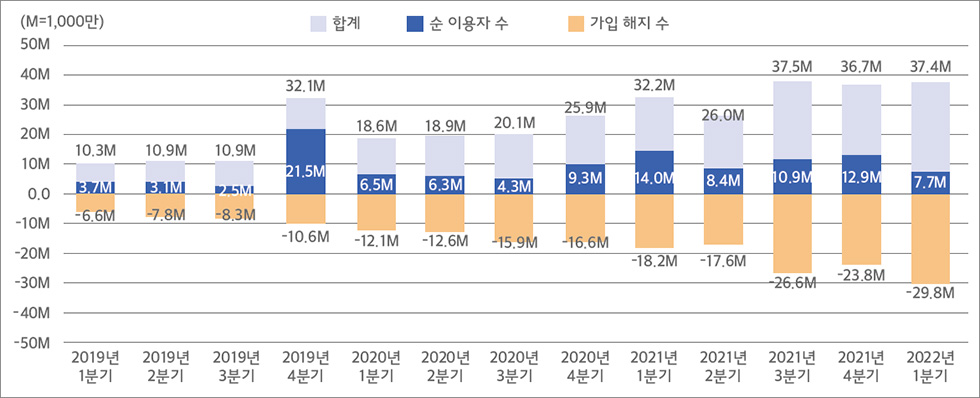 <그래프> 2019년~2022년 1분기까지의 분기별 미국 SVOD 구독자 성장 추이. 가입자수 증가만큼이나 해지 또한 많아서 가입자 순증이 크지 않았다.
