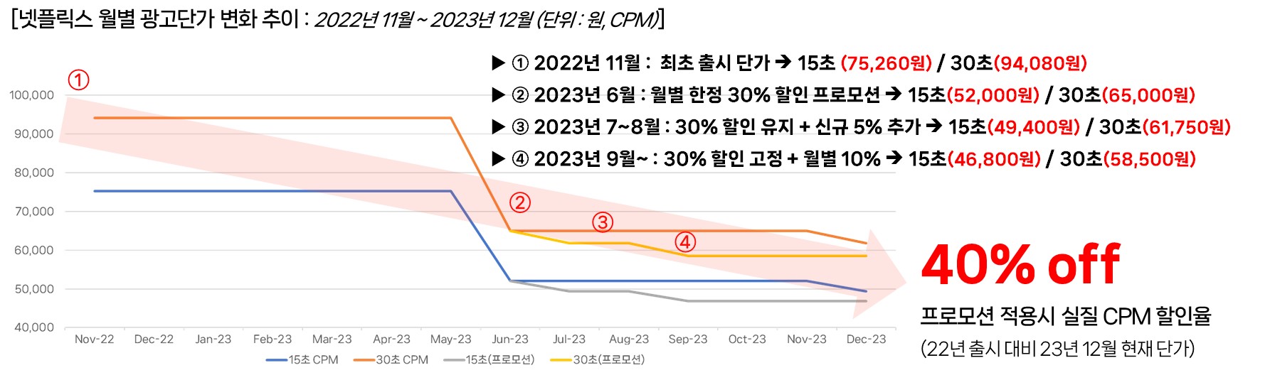 그 결과 광고요금제 출시 만 1년이 지난 23년 12월에는, 22년 11월 출시 대비하여 약 40% 가량 할인된 실질 CPM이 정착됩니다. (아래 표)