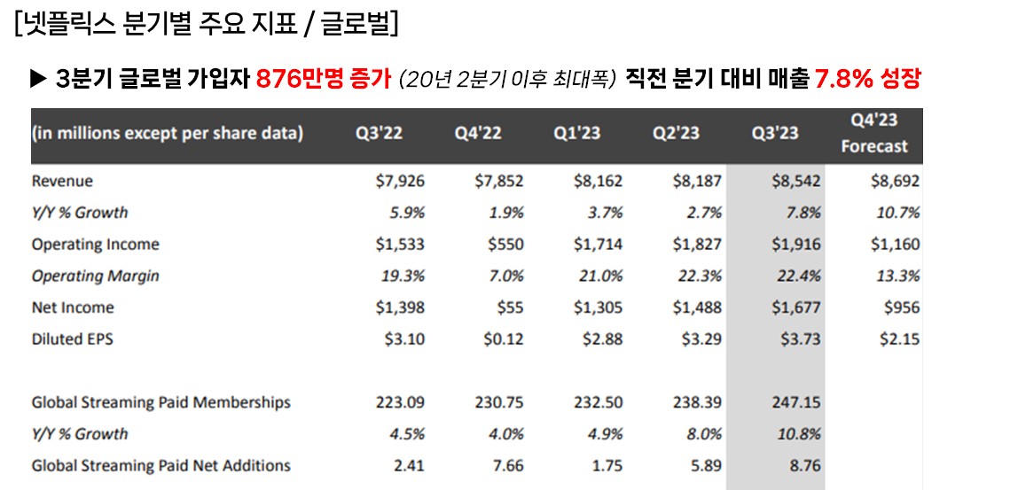 (출처 : NETFLIX IR, 2023년 2분기 및 3분기 보고서)