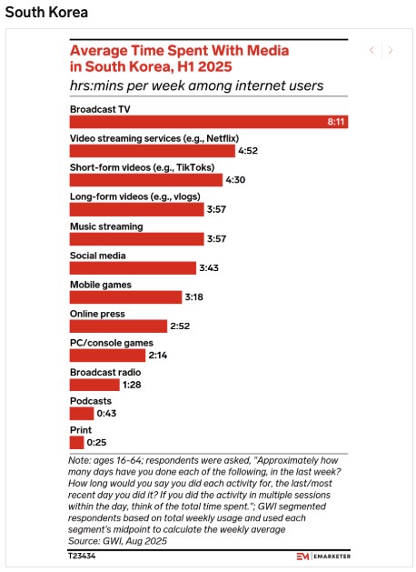 <설명> 2025년 상반기 기준, 한국에서의 플랫폼별 주간 소비시간 비중. 1주일에 방송은 8시간 11분으로 단일 플랫폼으로는 가장 많이 보는 것 같지만, 디지털 비디오는 3가지 형태(스트리밍, 숏폼, 롱폼) 합산시 13시간을 훌쩍 넘는다. (출처 : eMarketer / GWI, Aug 2025) |