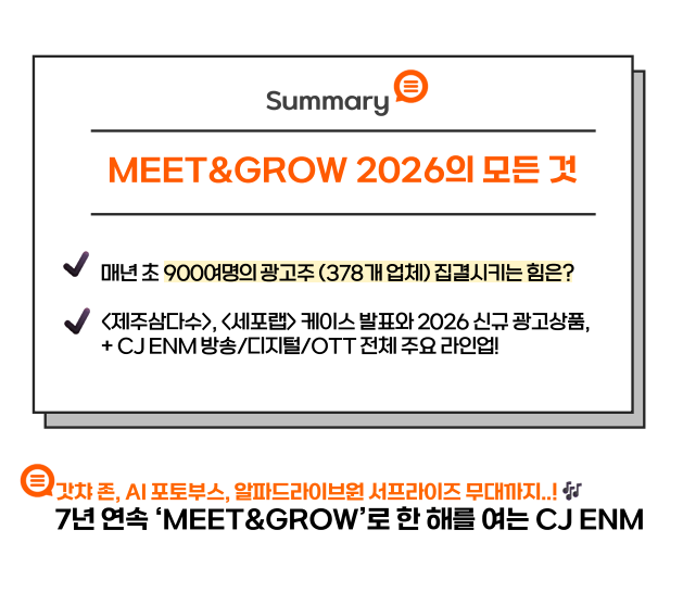 CJ ENM 전 채널의 라인업과 상품군별 솔루션을 한 자리에서 선보이는 최대 행사. 광고주 대상 설명회 MEET & GROW 2026이 올해도 2월 초 성황리에 개최되었습니다. 행사 1주 전까지 사전신청을 받은 378개 업체에서 참석하며 뜨거운 관심을 보였는데요.