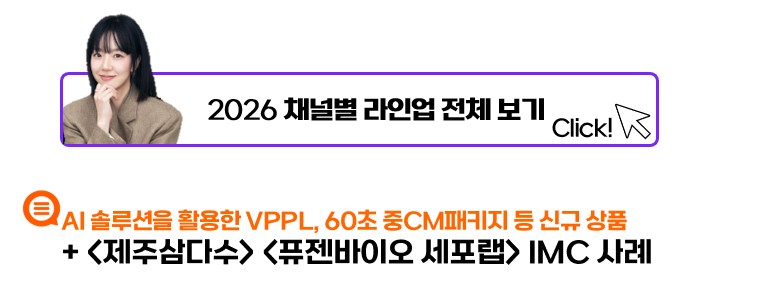 중CM 구간 독점이 가능한 장초수 패키지부터, 2026년 신규 광고상품 소개 영상까지! 위 이미지를 클릭하시면, 광고주 설명회 전체 영상을 관심있는 세션별로 다시보기하실 수 있습니다.