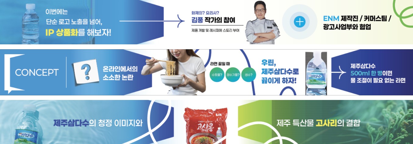<제주 삼다수>는 (제주개발공사 마케팅기획팀 문지오님 발표) 브랜드 모델인 박보영의 tvN <미지의 서울> 흥행 당시 IP연계 적극 노출로 CJ ENM 매체파워를 적극 활용하였으며, 단순 노출을 넘어 IP 상품화를 기획하기 위해 광고사업부 및 커머스팀, ENM 제작진과도 협업하여 '고사롱 라면' 출시 히스토리를 공개하며 큰 인사이트와 공감을 얻었습니다.